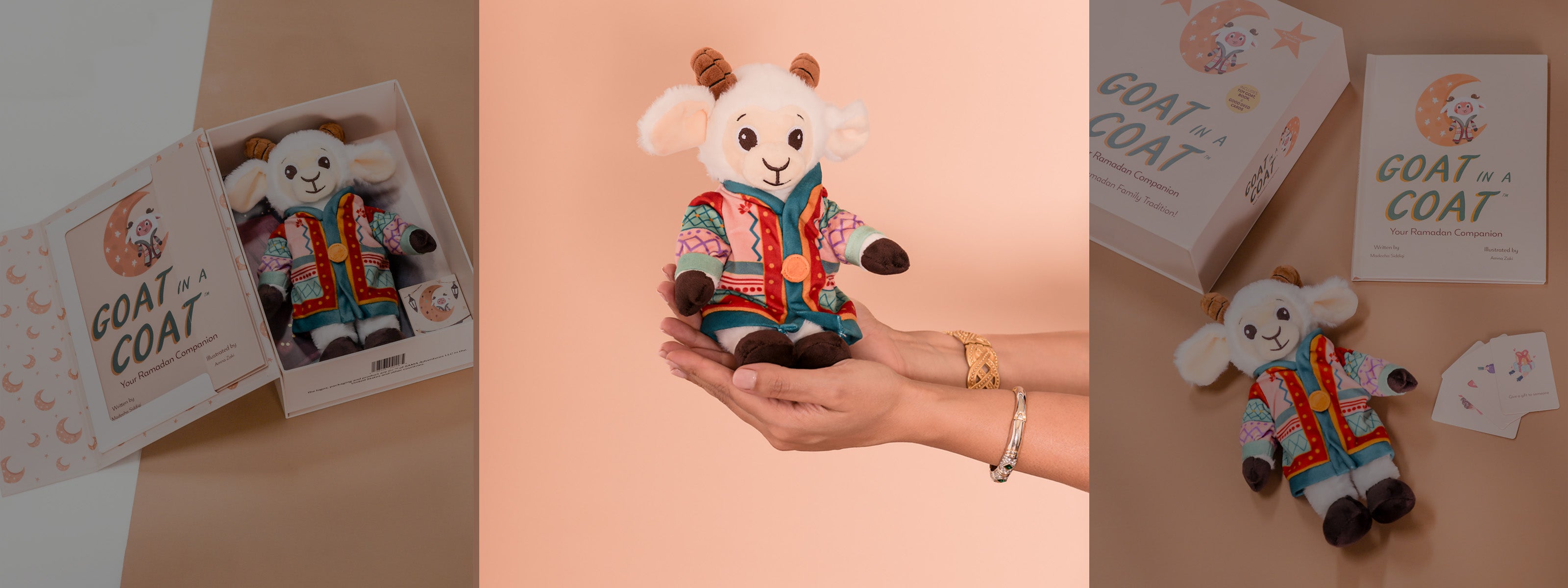 Introducing Goat in a Coat! A companion toy and book for your little ones, guiding them through good deeds and kind acts from the first day of Ramadan to the joyous day of Eid. Start this new tradition with your family this Ramadan!